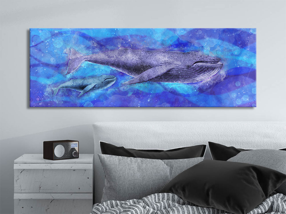 Drifting through an ethereal sea of deep blues and purples, Vintage Cosmic Space Whales reimagines a historical scientific illustration with a celestial twist. This remixed print breathes new life into an 1872 zoological engraving of Megaptera versabilis from Natural History of the Cetaceans and Other Marine Mammals of the Western Coast of North America by Charles Melville Scammon (1825–1911).