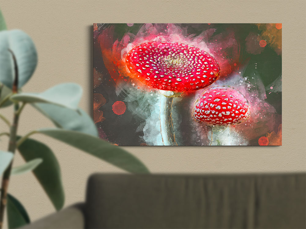 This digital photo painting features Amanita muscaria, a species of mushroom known for its distinctive red cap with white spots. The iconic mushrooms, called Fliegen Pilz in German, are often depicted in folklore and fairy tales. These particular mushrooms were discovered on a hike near Germany‘s famed black forest.