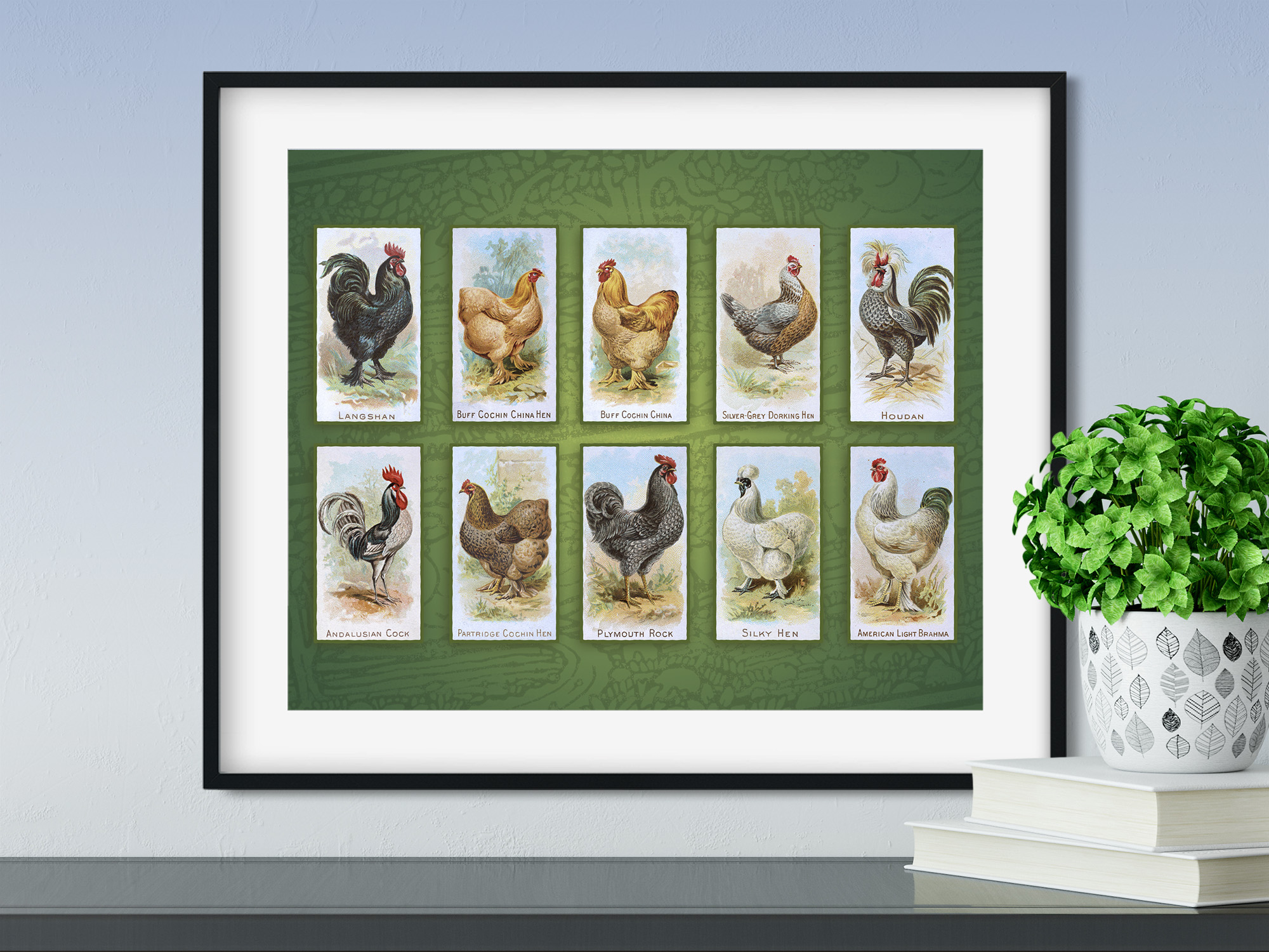 Dive into a delightful piece of history with this Remixed Historical Print, showcasing a vibrant collection of fancy breed chickens straight from the 1891 Prize and Game Chickens series by Allen & Ginter Cigarettes.