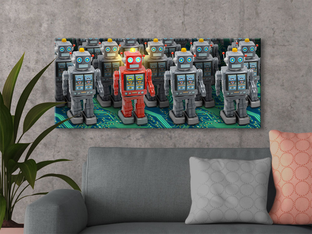 The digital painting started with a single photograph of a single toy and a separate photograph of a circuit board. All of the duplicate toys, shadows, lighting effects, depth effects, perspective, and color alterations were done digitally.