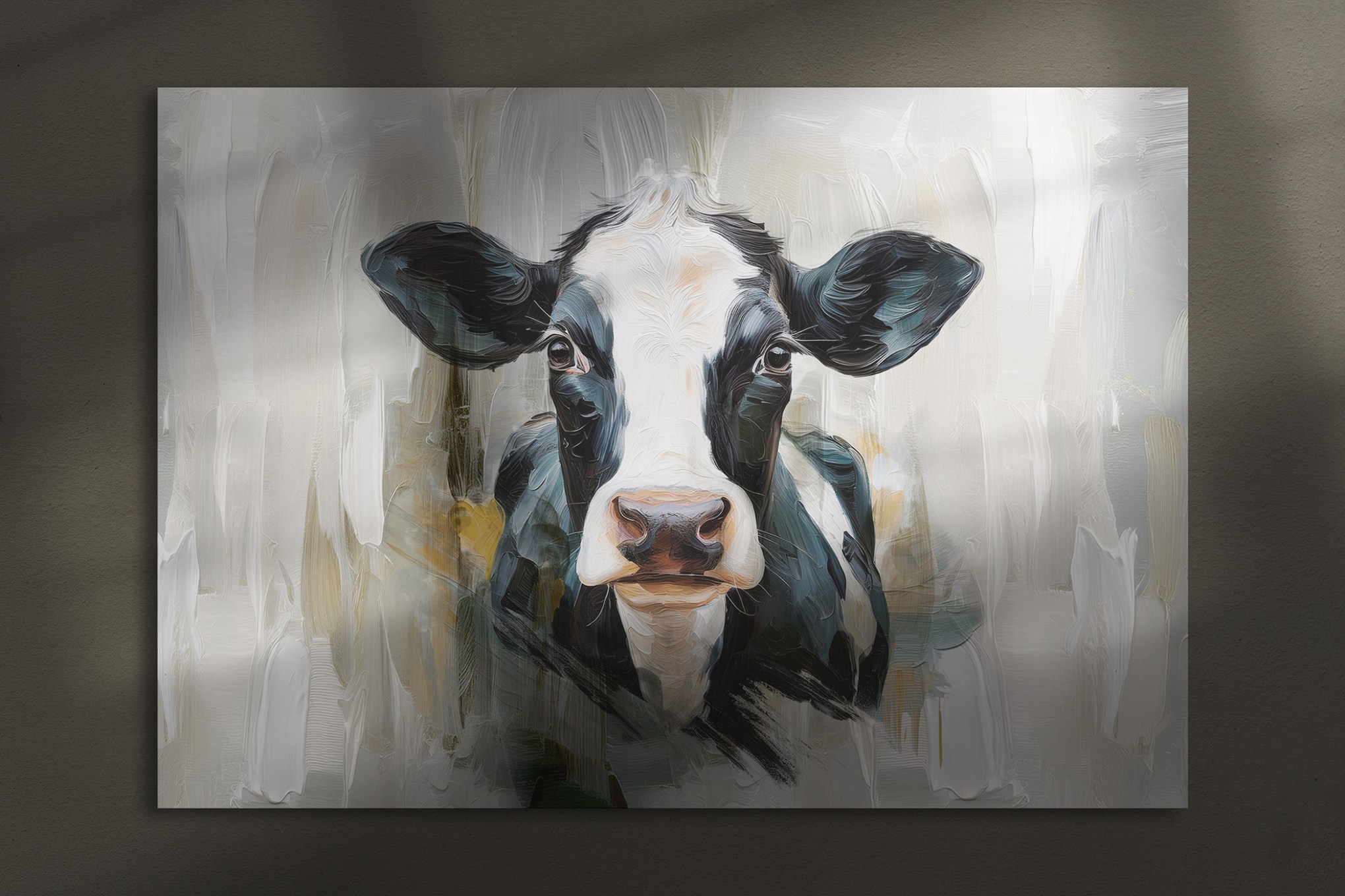 This digital photo painting captures the essence of a striking black and white Holstein dairy cow. Crafted with the dynamic palette knife impasto style, each stroke brings texture and depth to this serene countryside icon.