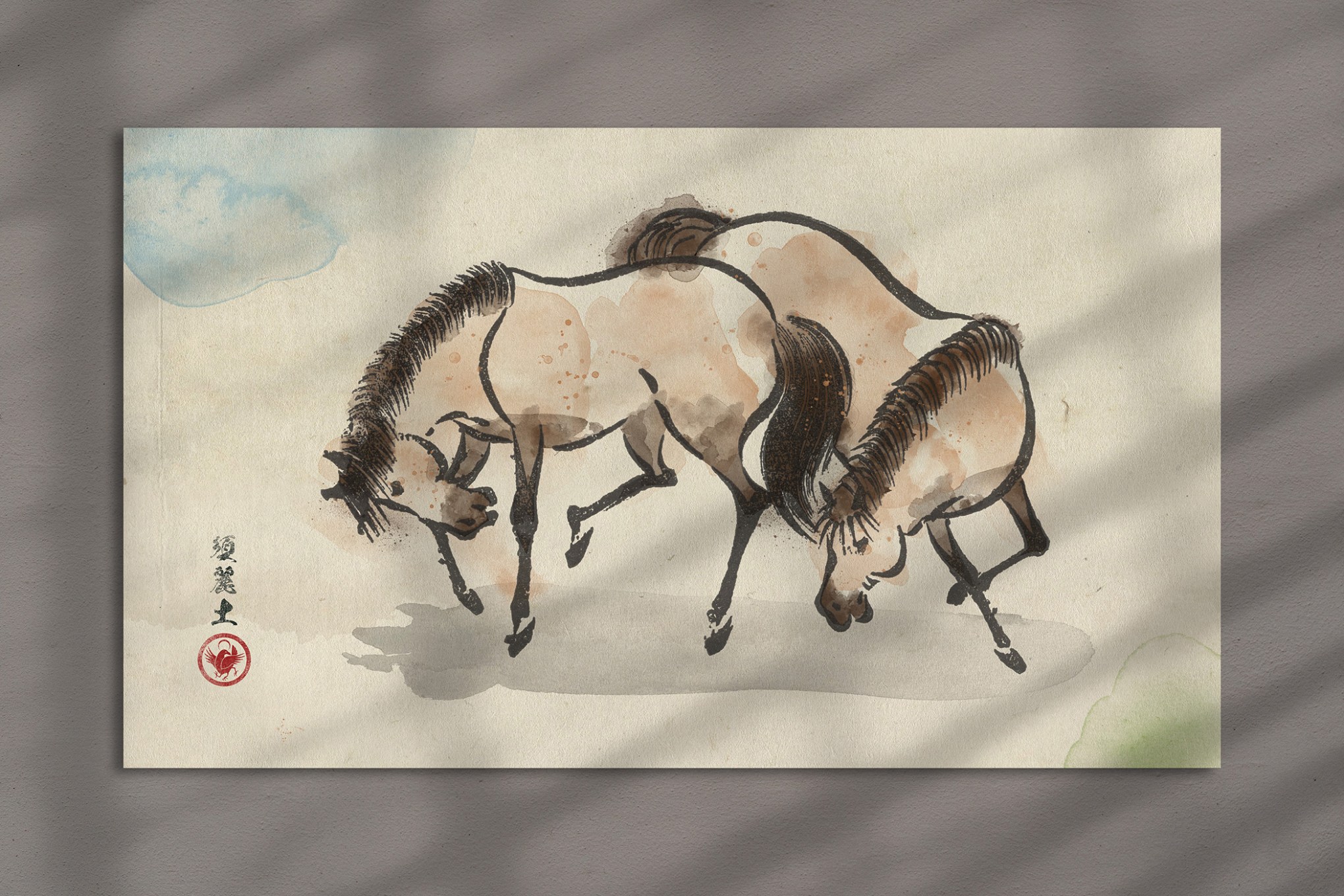 This remixed historical print features outlines of horses from an old, black and white Japanese woodblock print, remixed and updated with watercolor accents.