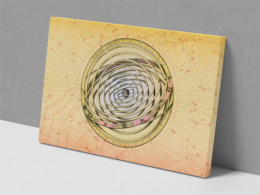 Explore the cosmos with this remixed historical print featuring an antique latin solar system and zodiac chart, reimagined with vibrant color enhancements, sharpened details, and vintage poster-style halftone patterns that evoke the retro space age aesthetic.