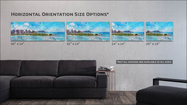 Many of our original works are available in a range of sizes. The featured image above shows the full range of size options for art in a horizontal or landscape orientation. Sizes are available from 20″ x 14″ up to 40″ x 14″.
